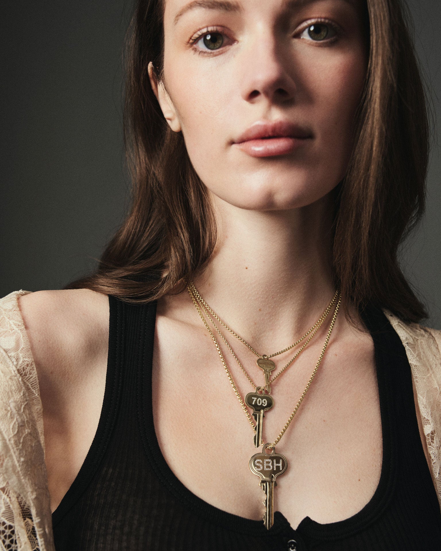 Our keys are solid 14 karat gold throughout with a semi polished finish. Modeled after a vintage house key, our keys are the same measurements and thickness of an actual key. The weight of the gold combined with the intricate and meaningful design of each key gives them an extraordinary feeling to wear. Each one is a stunning one-of-a-kind treasure and heirloom.