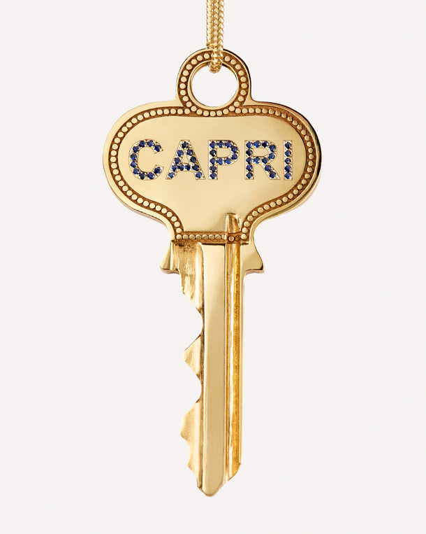 This custom key is made from 14 karat gold and sapphires. The inlaid sapphires are micro pave set by hand. Each key is handmade in California. The CAPRI key pictured is made with royal blue sapphires. To request a different color sapphire or other colored gemstone, please email us at checkin@lebungalow.com.