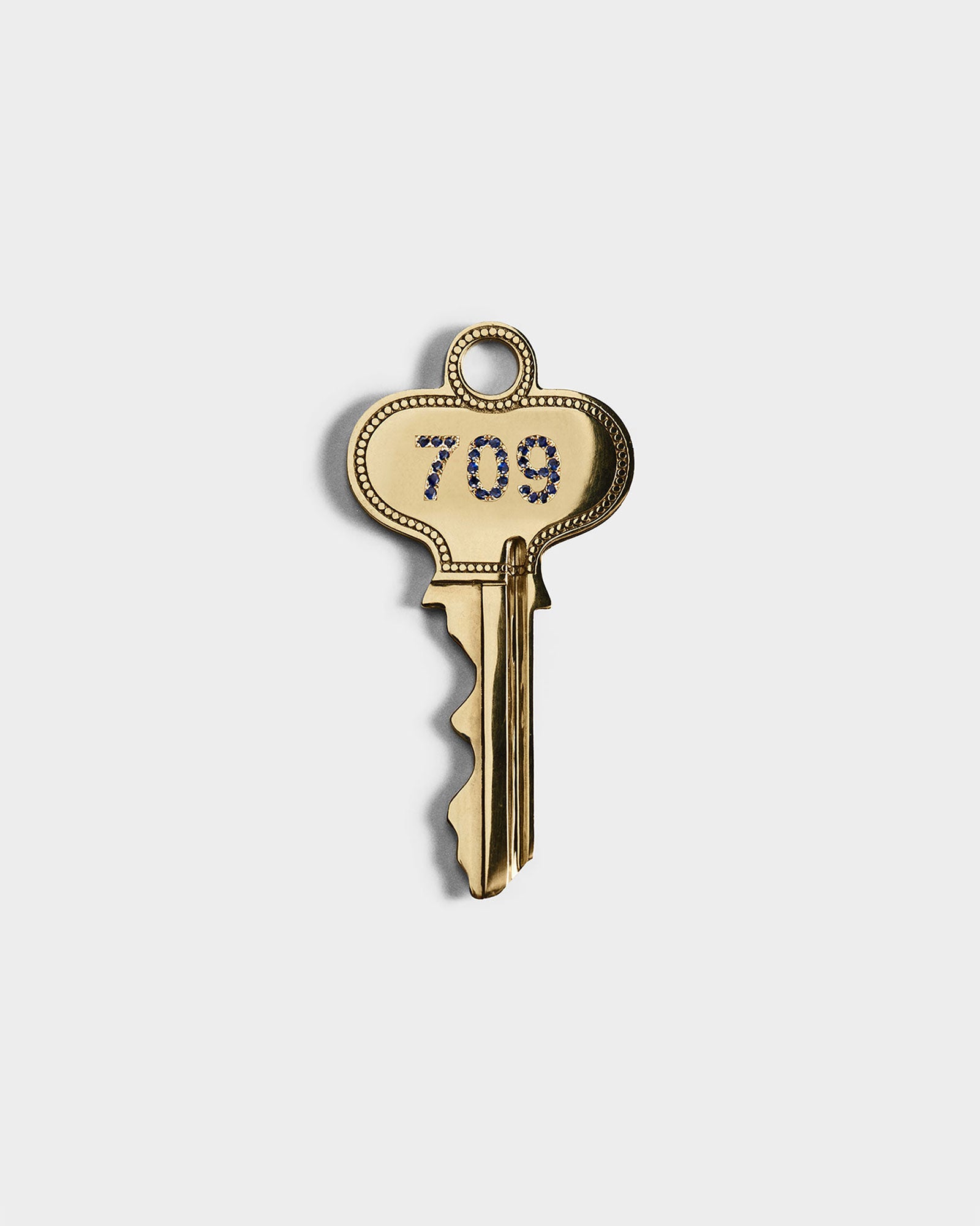 This custom key is made from 14 karat gold and sapphires. The inlaid sapphires are micro pave set by hand. Each key is handmade in California. The 709 key pictured is made with royal blue sapphires. To request a different color sapphire or other colored gemstone, please email us at checkin@lebungalow.com.