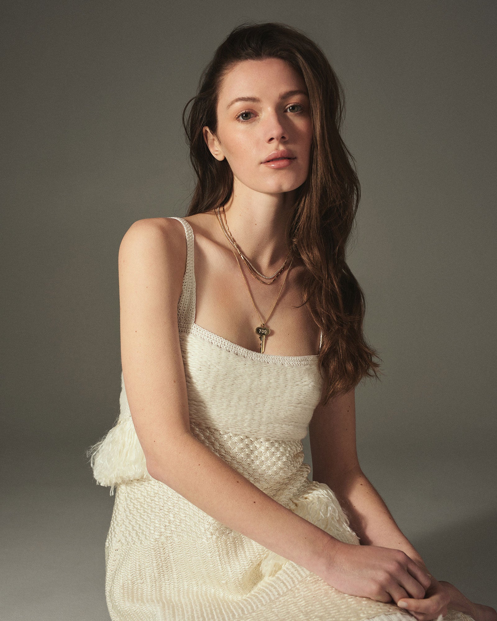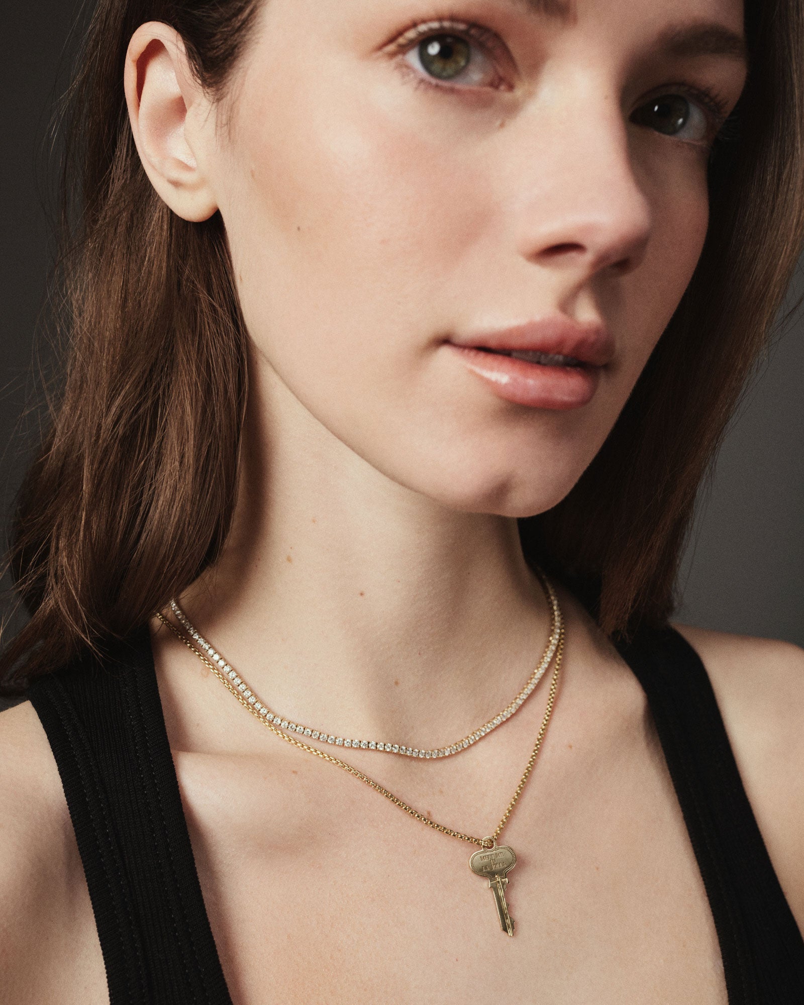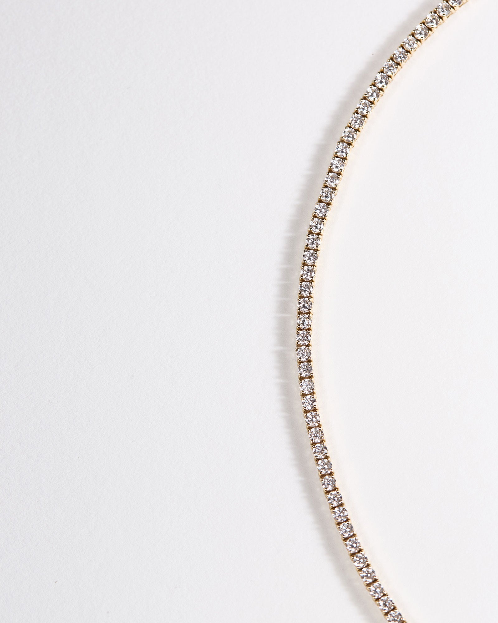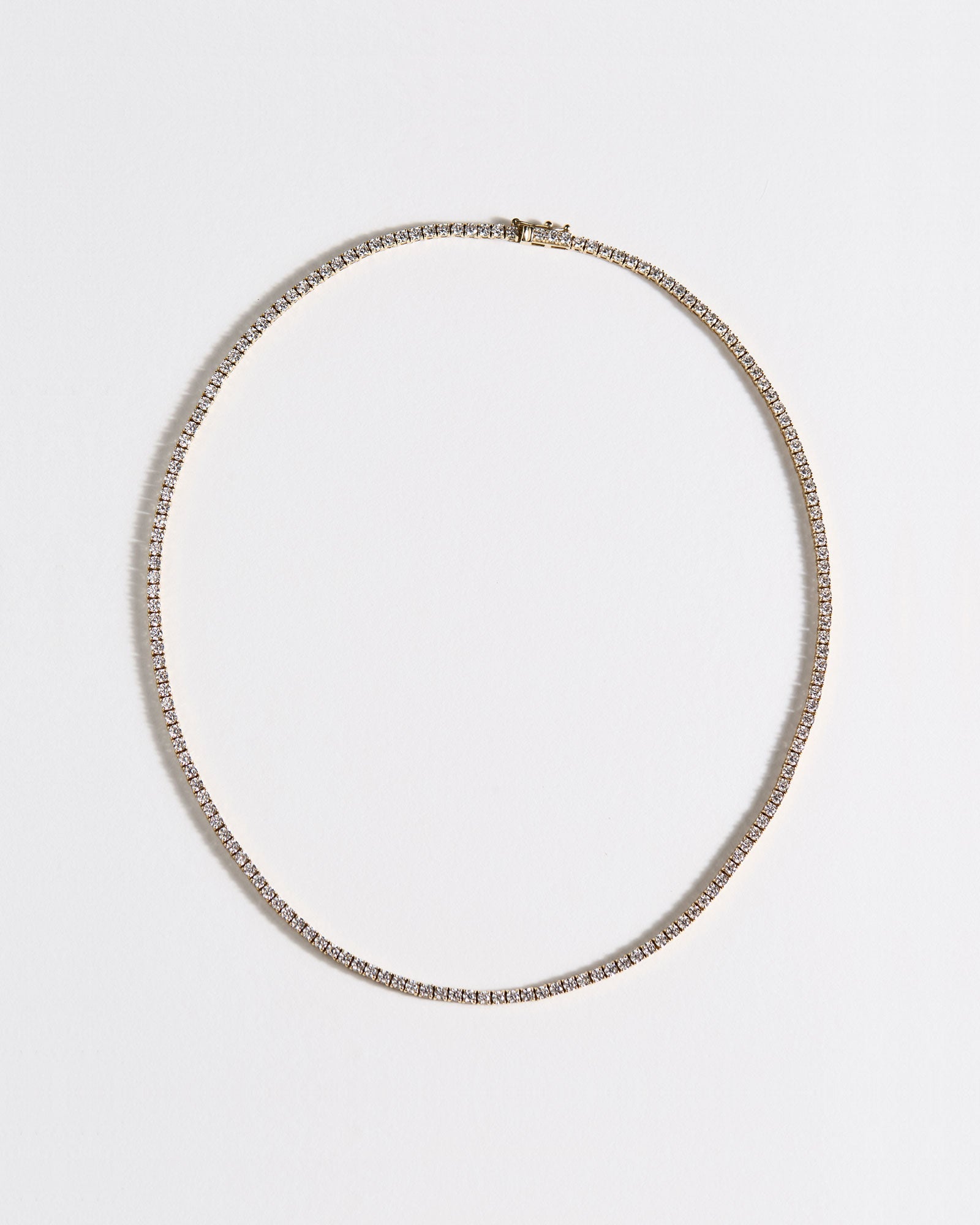 Our Meet Me On The Court necklace is 15 ½ inches long and contains 7.12 carat weight of natural, round brilliant-cut diamonds in a four-prong setting. Should you want to custom order a different length or carat weight, email checkin@lebungalow.com.