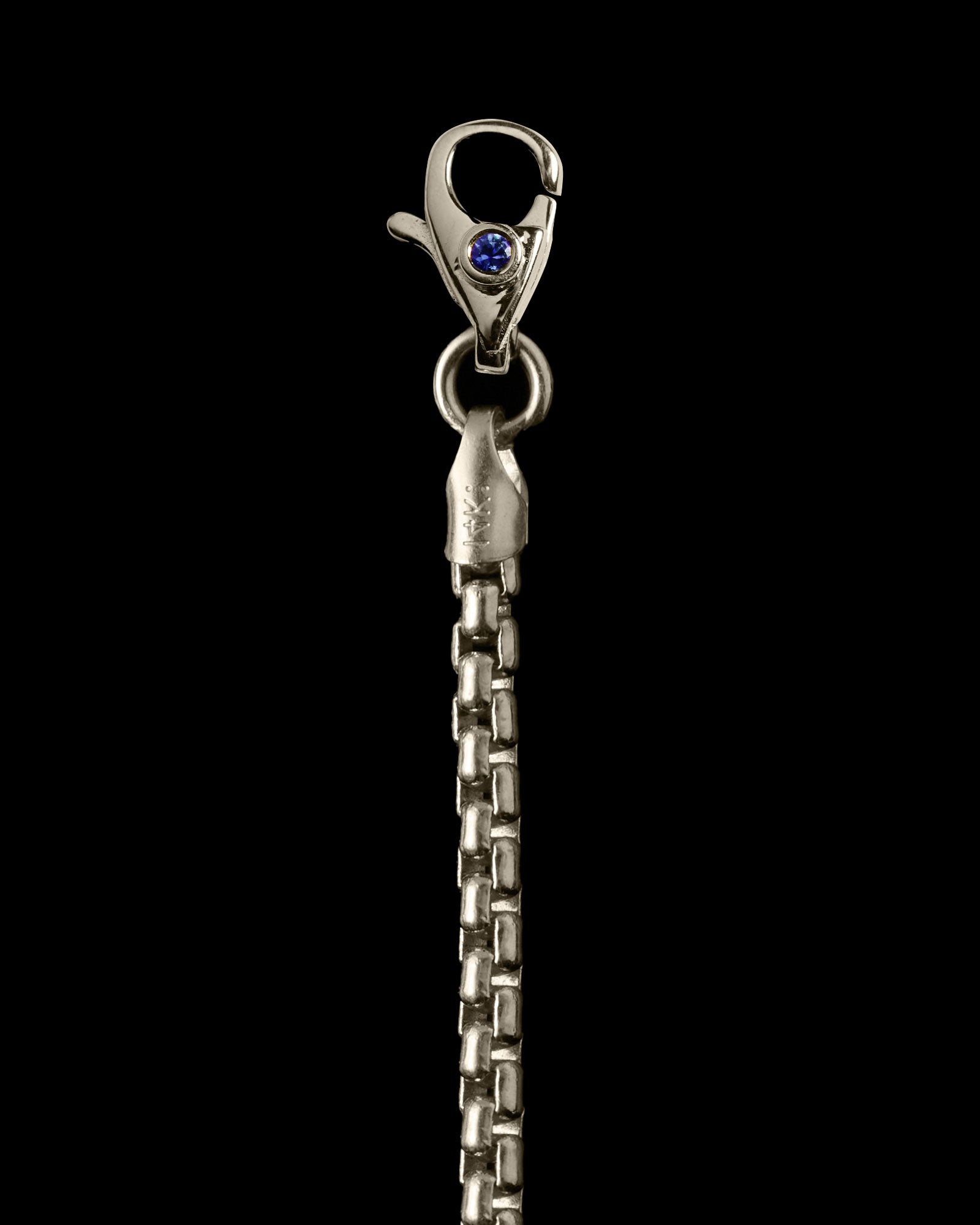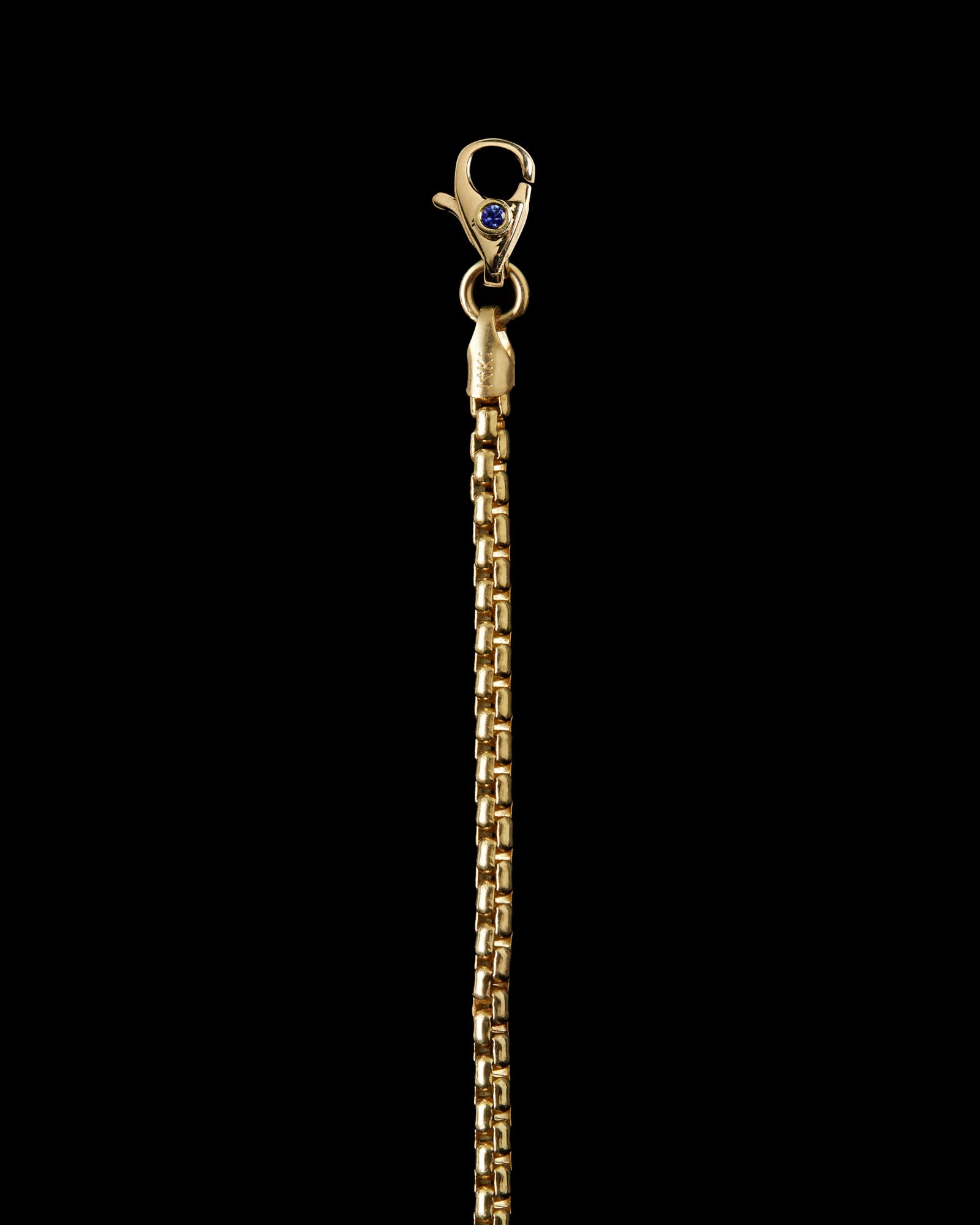 Italian rounded box chain in 14k solid gold. Every chain comes with a lobster clasp with a handset, vibrant blue sapphire representing the sea and the sky.